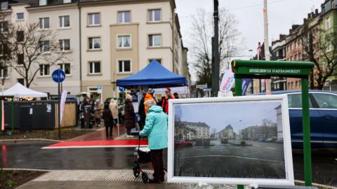 Bereits kurz vor 16:00 Uhr, dem offiziellen Beginn der Eröffnungsfeier, versammelten sich die ersten Interessierten auf der neuen Mobilitätsstation Römerstraße. Kurz darauf eröffneten die Bezirksvertreterin Sabine Schmidt und unsere Kommunikationsleiterin Ariane Kersting die Feier und betonten, dass die Mobilitätsstation, die bislang zweitgrößte der Stadt ist. Besonders wichtig war, neben neuen Mobilitätsangeboten, auch die Sicherheit für den Fuß- und Radverkehr deutlich zu verbessern. Insgesamt wurden dafür ca. 1.500 m² umgebaut. Gehwege wurden vorgezogen und vergrößert, die Querung über die Kreuzung somit verkürzt, barrierefreie Fußgängerüberwege gebaut und die Straßenführung angepasst. Wie sehr sich der Ort verändert hat, konnten die Anwohner*innen mit aufgestellten Vorher-Fotos direkt vor Ort sehen.